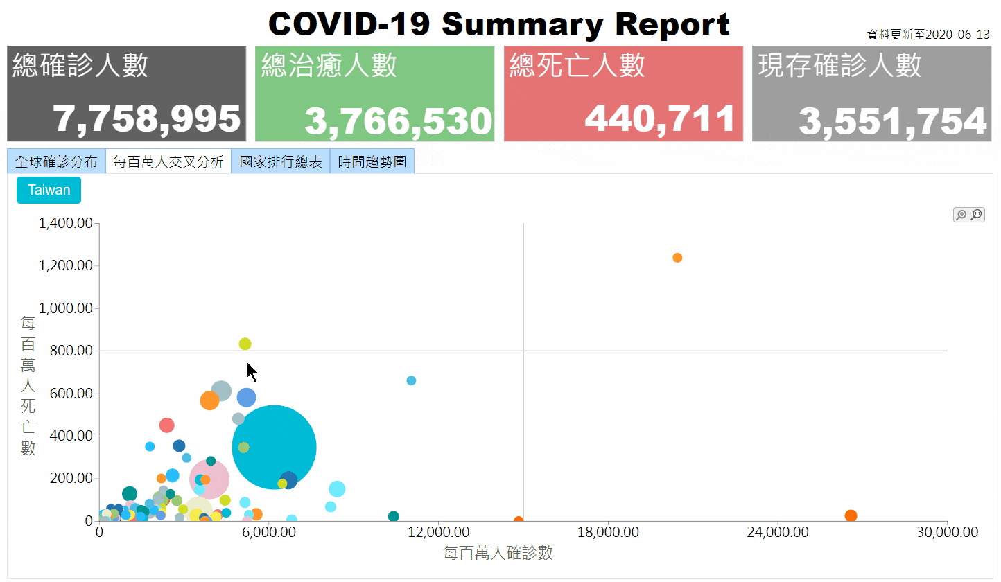 在此泡泡圖上,每個獨立的泡泡代表國家,X軸是每百萬人死亡數、Y軸是每百萬人確診數,Z軸是累計確診數,可以一眼看出目前確診總數最多的美國泡泡為最大顆。(圖3)
