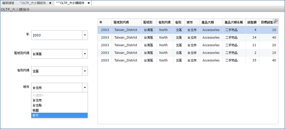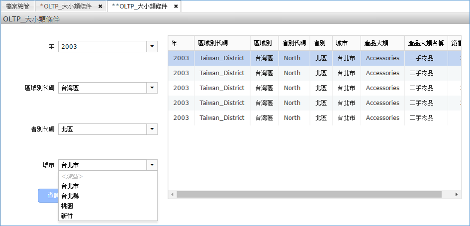 分別在欄位中針對年、區域別代碼、省別代碼及城市四個欄位按右鍵,選擇新增至條件中的單一條件。即可在條件區塊中看到對應的個條件。