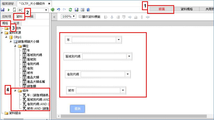 點選左上角切換至"資料"頁籤中的"規格",並選擇銷售明細大小中的條件,一一拖拉放至設計畫面中。