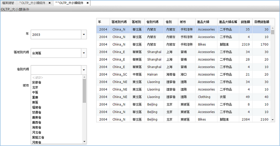年、區域別代碼、省別代碼、城市、產品大類、銷售額 |