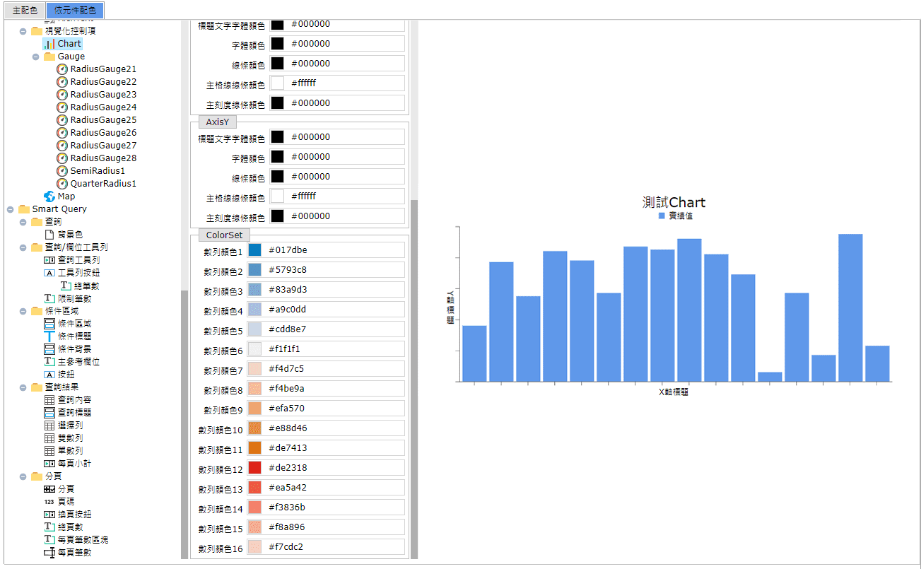 「依元件配色」是針對個別的元件、資料表做顏色設定,不同於主配色頁籤,此頁籤的設定較為細膩。介面切成三區塊,左邊區塊依照產品類型(Smart eVision、Smart Query)列出該產品的所有元件,小蘭先選擇視覺化控制項Chart進行顏色設定。選了Chart之後,中間區塊會列出Chart所能設定的屬性,如顏色與字體大小,而右方區塊則立即呈現預覽效果。