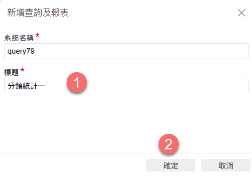 在「新增查詢及報表」視窗中,輸入標題(例如:分類統計一),完成後點選「確定」,進入資料來源設定畫面,準備設計查詢內容。