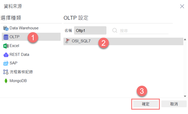 在「資料來源」設定畫面中,左側選擇來源類型為「OLTP」,右側點選欲使用的資料庫(例如:OSI_SQL7),確認後點選「確定」,完成資料來源的連結設定。