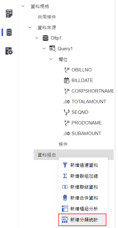 在資料來源的查詢節點下,點選「資料組合」區塊右鍵,選擇「新增分類統計」,建立一個資料組合,將明細資料依指定欄位分類並橫向展開排列。