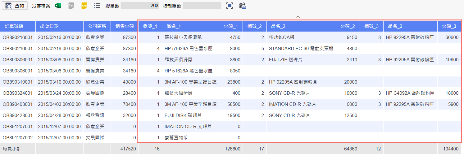 當需要將某一筆資料下的多筆明細(如:出貨明細、訂單明細)依序分類,並橫向展開排列時,適合使用此功能。例如:將出貨資料中的『欄號、品名、金額』依出貨序號依次排列,讓同一筆主檔資料的細項統計能橫向呈現,方便彙整或製作對應的報表格式。