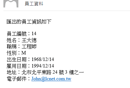 (圖5)查詢員工資料後,勾選需要的資料列,點選「資料寄送Mail」按鈕,將資料結果寄送至使用者信箱,例如:王大德。(圖6)接著到Outlook查看寄出的Email內容,有成功帶入王大德這位員工的相關基本資料。