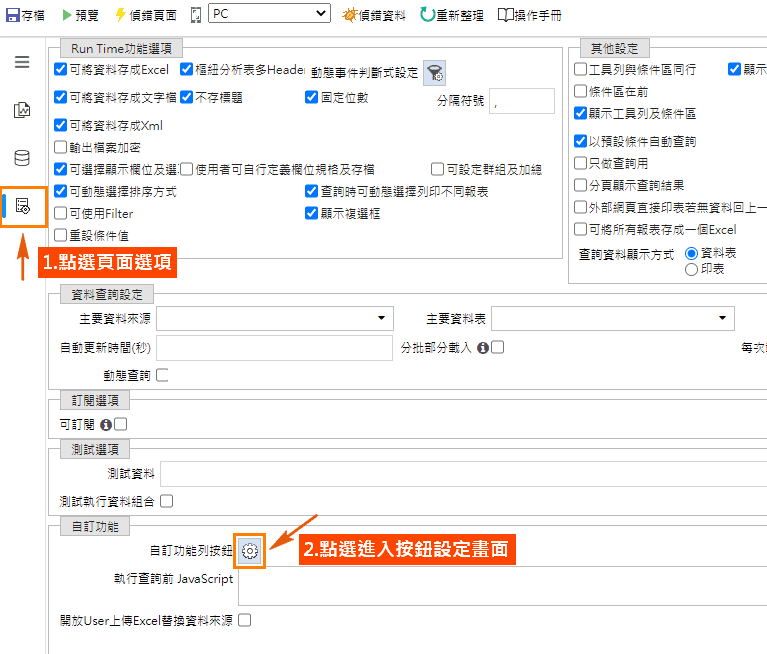 在查詢頁面的「頁面選項」設定中點選圖示「自訂功能列按鈕」(圖2)開啟按鈕設定畫面,可增加按鈕數量與編輯按鈕名稱(圖3),點選「Action圖示」即可開啟Actionflow設計畫面(圖4)。