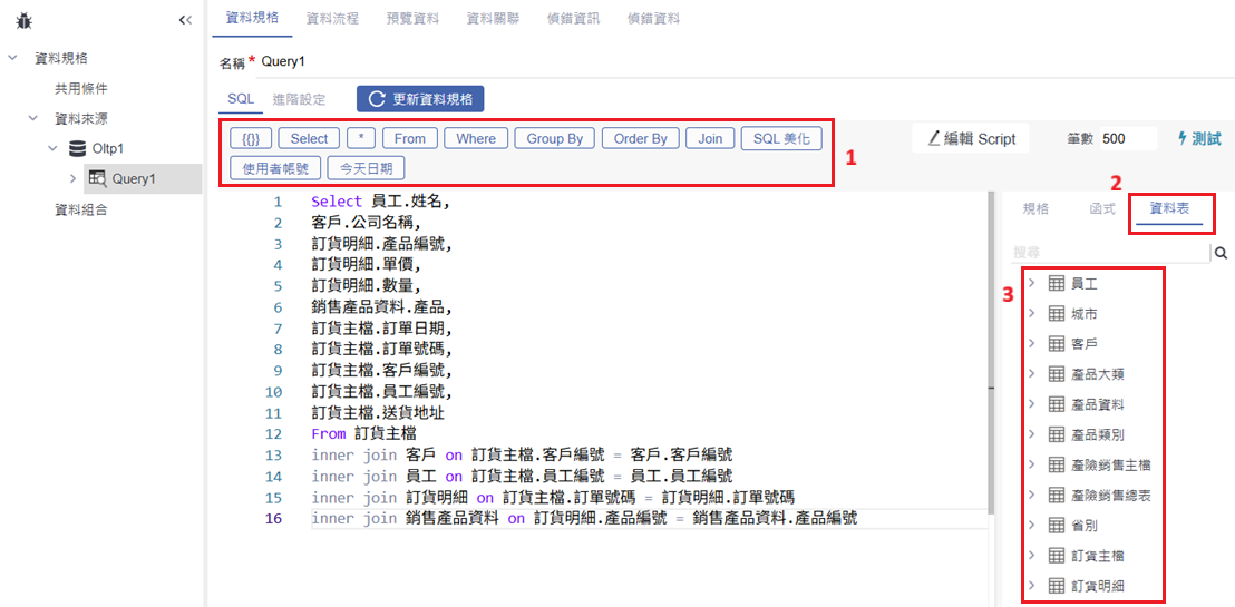 此範例中會介紹,利用OLTP資料來源建立一支查詢,並用JOIN的SQL語法將多個資料表關聯在一起,才能在同一個查詢畫面上呈現多個table所select出來的資料。