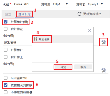 在「進階設定」頁籤中,勾選「計算總計(欄)」,點擊「小計(欄)」右側的按鈕後選擇「類別名稱」,最後勾選「依據欄及列排序」。