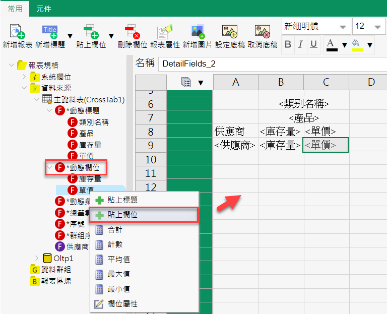 Step7. 於報表設計位置「B9」及「C9」挑選到動態欄位的[庫存量][單價]右鍵「貼上欄位」