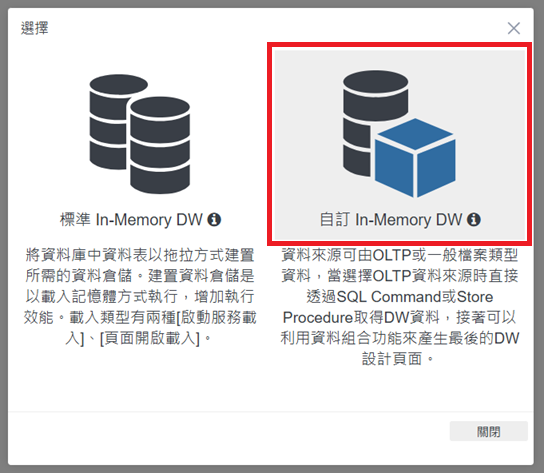 點選「新增資料倉儲」,選擇「自訂 In-Memory DW」。