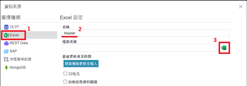 種類選擇Excel,重新命名,再點選檔案名稱右側的Excel圖示以選擇檔案。