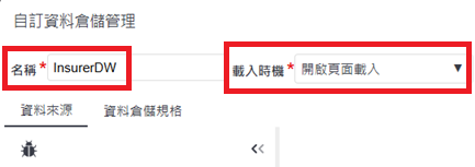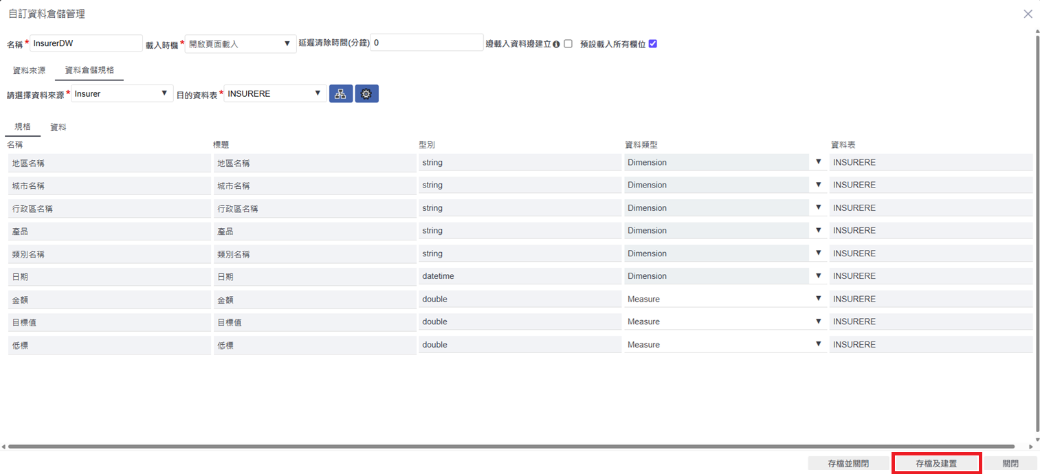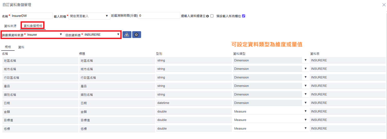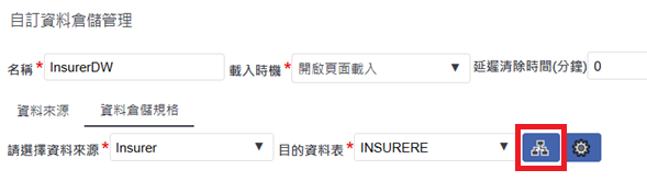 切換到「資料倉儲規格」,確認資料來源為「Insurer」、目的資料表為「INSURERE」;