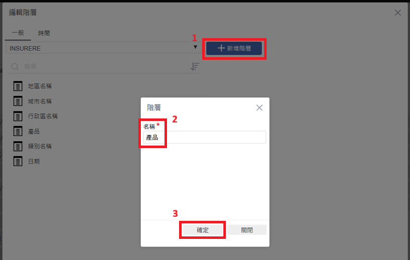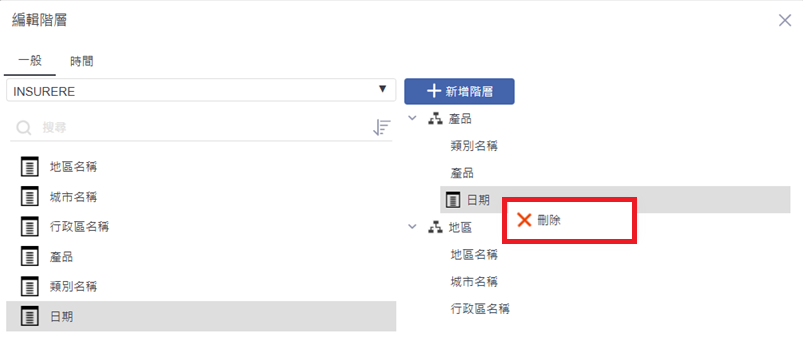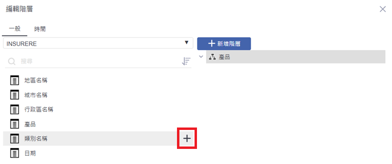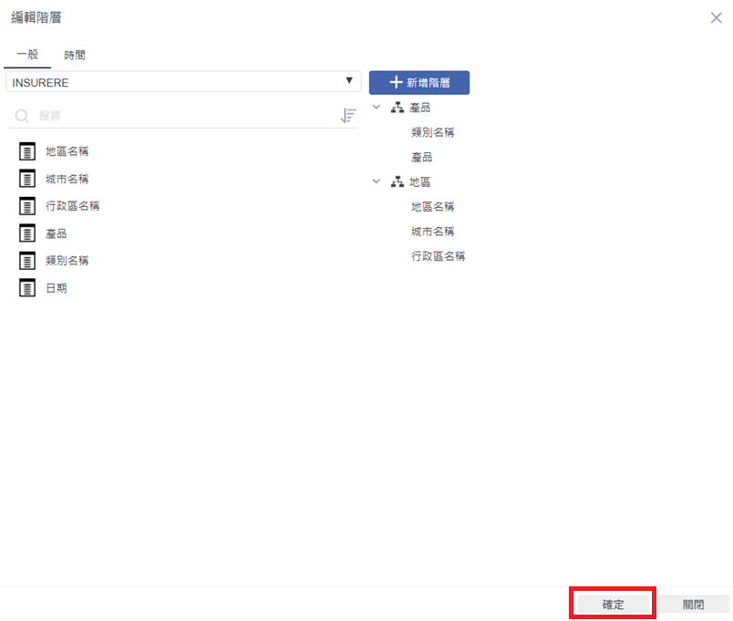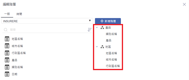 點選「編輯階層」,新增階層「產品」、「地區」,再將左方的欄位以右方的「+」或雙擊滑鼠左鍵的方式代入各階層中。