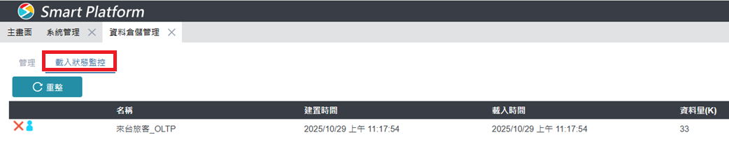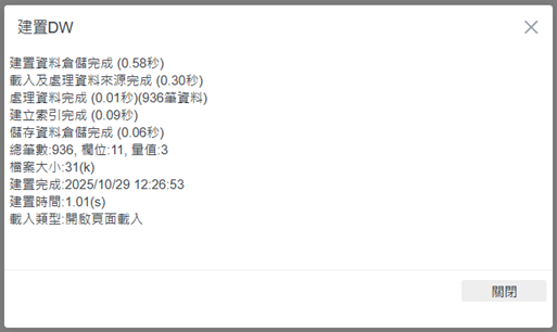 也可到「載入狀態監控」,可得知系統上有哪些資料倉儲(DW)、分別的建置與載入時間、資料量等資訊。