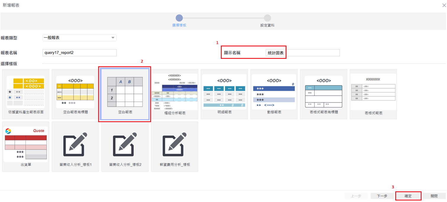 顯示名稱輸入「統計圖表」,樣板選擇「空白報表」,再按下確定。