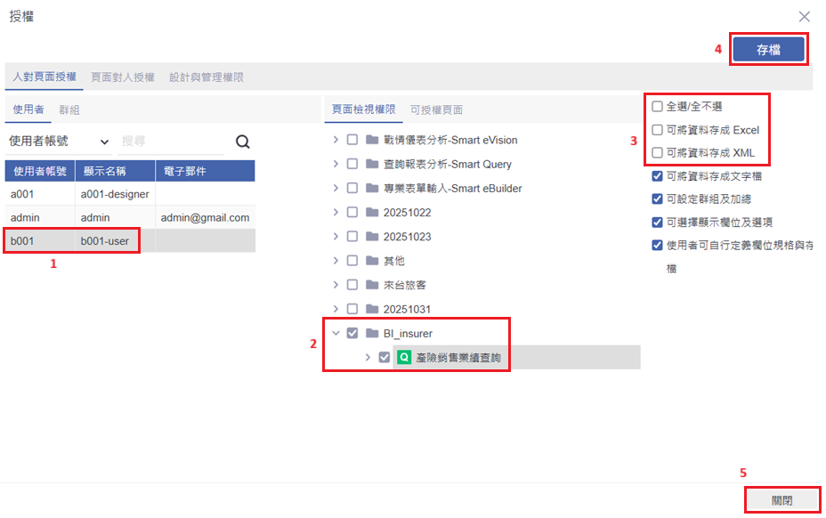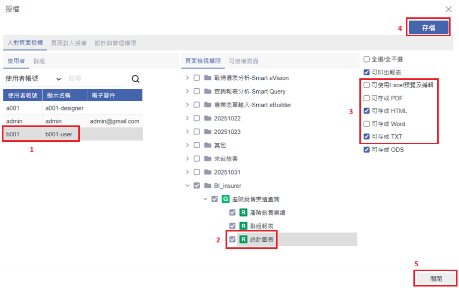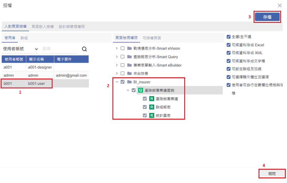 在頁面授權時也能授權是否能另存資料形式,如:excel、pdf、word、html。
