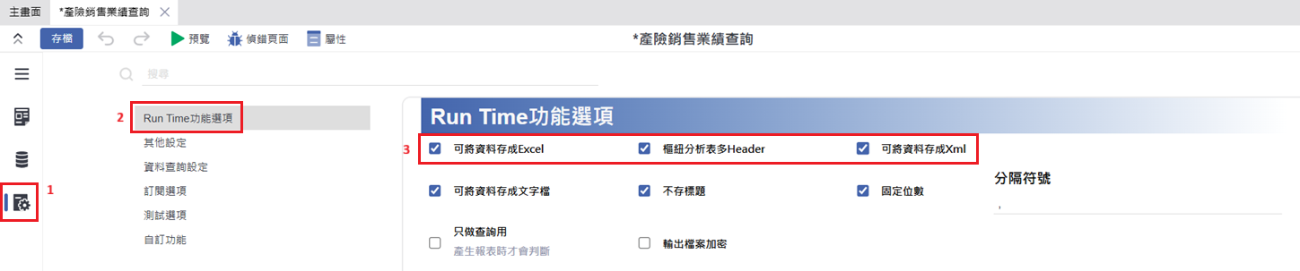 該查詢或報表頁面必須要勾選能轉出此形式才會有效果。先進入編輯畫面,點選左側的「頁面選項」,將「Run Time功能選項」中的Excel、Xml、文字檔等打勾,