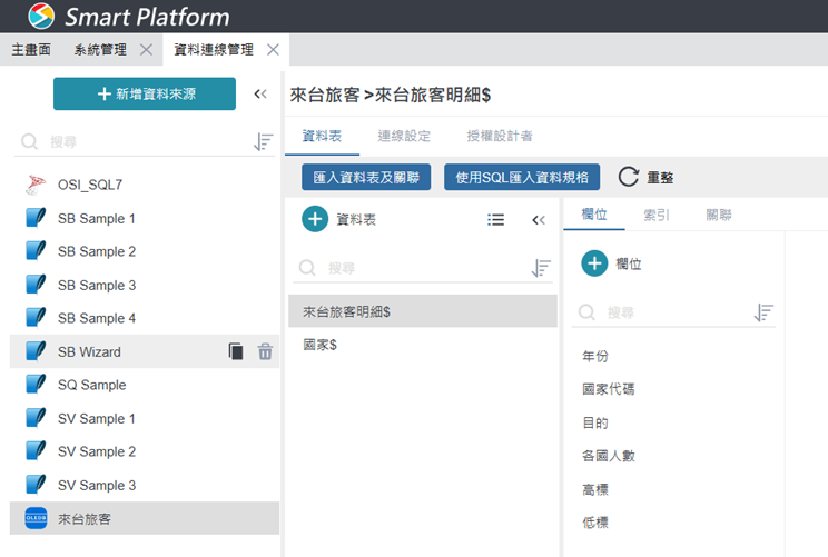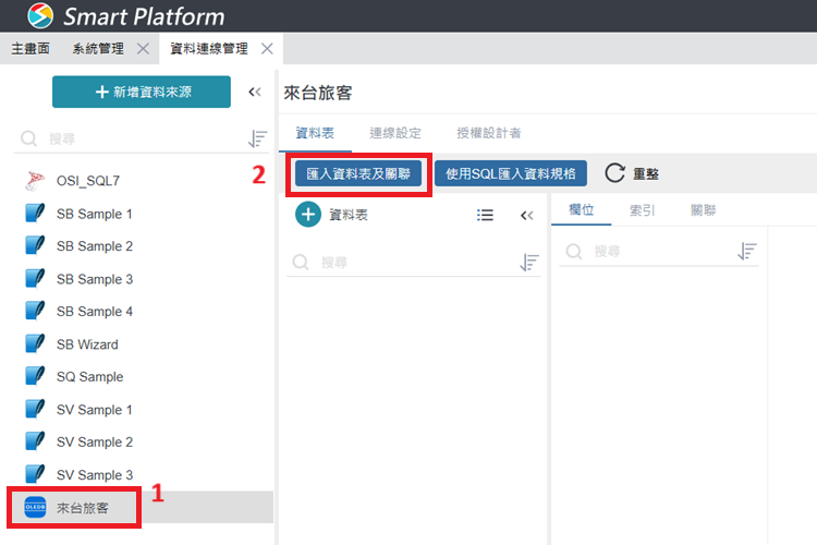 在資料庫連線管理的頁面,點選剛剛新增的名稱(來台旅客),點選「匯入資料表及關聯」,