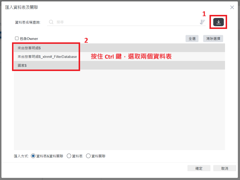 接著點選載入,使用ctrl鍵+滑鼠左鍵,選取兩個資料表後,再按下確定