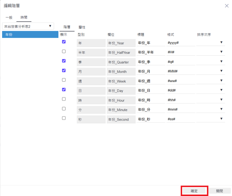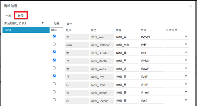 點選「編輯階層」,切換到時間、屬性的頁面,可調整顯示的時間類型,也確保系統之後能細分成這些欄位並讀入。