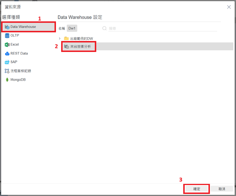 版面選擇「空白版面」,資料來源選擇 Data Warehouse 裡已建置好的「來台旅客分析」。