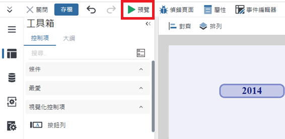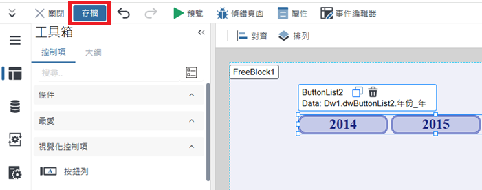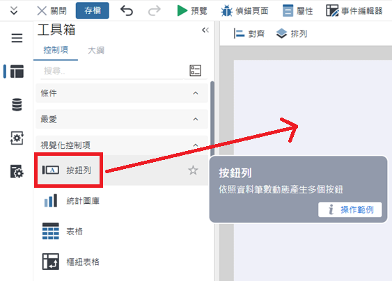 將工具箱中的按鈕列拖曳進畫面中,並在「按鈕列」控制項的子層中,選擇所要套用的類型。