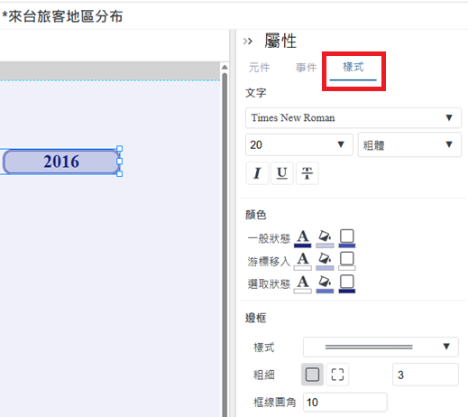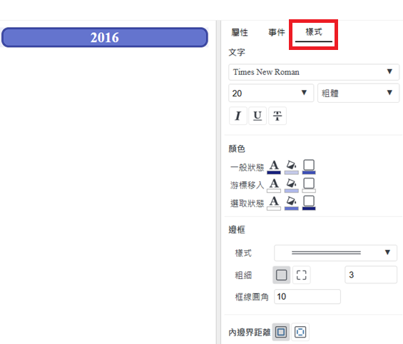 可在右側的「樣式」面板中調整字型、大小、顏色、框線等設定;