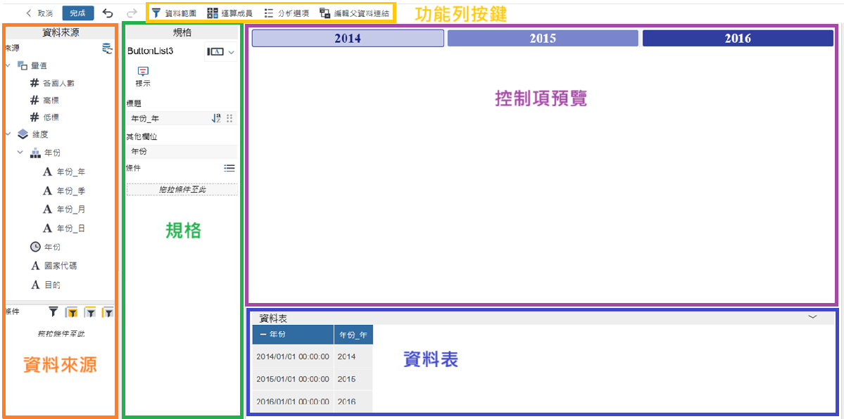 用來編輯各個控制項設定的區塊,透過控制項設計,將目前DW內現有的維度及量值進行拖拉擺放, 將控制項拖拉至版面後即彈出控制項設計,只支援DW/Olap資料來源,以下使用Chart為例:。詳細介紹可參考控制項設計。