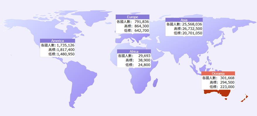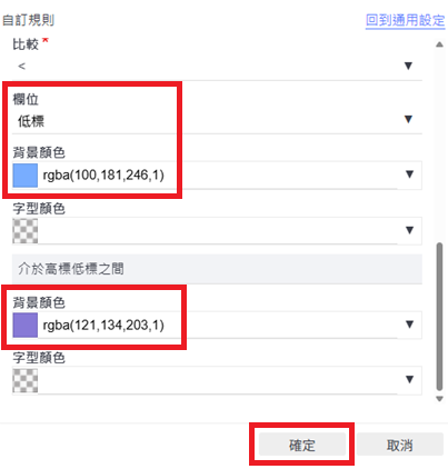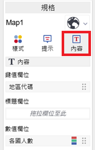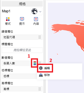 拖曳「各國人數」至「樣式」,點選「自訂規則」,便可設定數值符合設定的判斷條件時,將顯示之顏色。