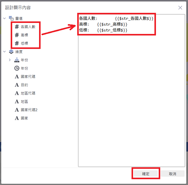 點選「內容」,將欲增加顯示的內容欄位拖拉到區域內,完成後點選確定。