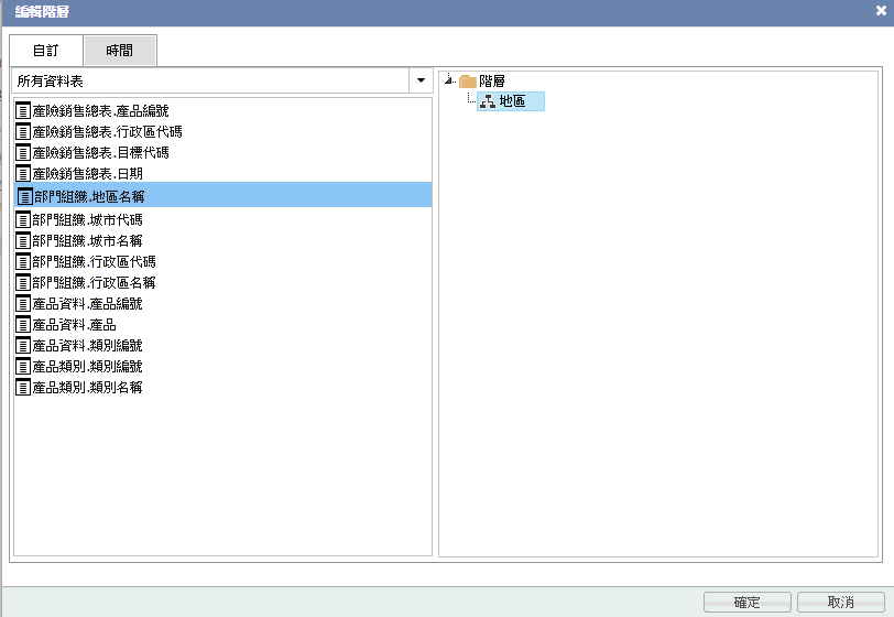 請使用[滑鼠左鍵]於[自訂]頁籤→拖拉所需求的欄位至[階層]中。