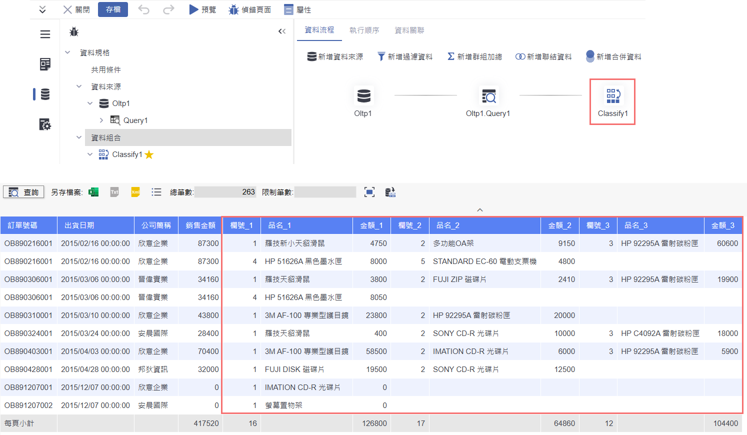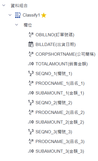 使用「資料組合 / 分類統計」功能,可針對出貨明細資料,將欄位內容(例如:欄號、品名、金額)依序號方式,從左至右分類排列,快速完成橫向展開的統計呈現。適合用來整理每筆出貨資料的細項內容,並將多筆資料橫向整併,方便後續分析與報表設計。