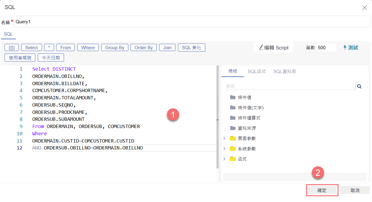 在 SQL 編輯畫面中,輸入查詢語法,範例如圖所示,結合訂單主檔(ORDERMAIN)、訂單明細(ORDERSUB)與客戶資料(COMCUSTOMER),查詢出貨明細的欄位內容(如:出貨單號、出貨日期、客戶簡稱、總金額、品名、數量等)。 完成 SQL 撰寫後,點選右下角「確定」,儲存查詢設定,作為後續分類統計的資料基礎。