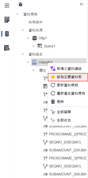 分類統計資料組合建立完成後,於「Classify1」上點選右鍵,選擇「設為主要資料表」,將分類統計的結果作為主要資料來源,確保後續呈現橫向展開的統計資料。