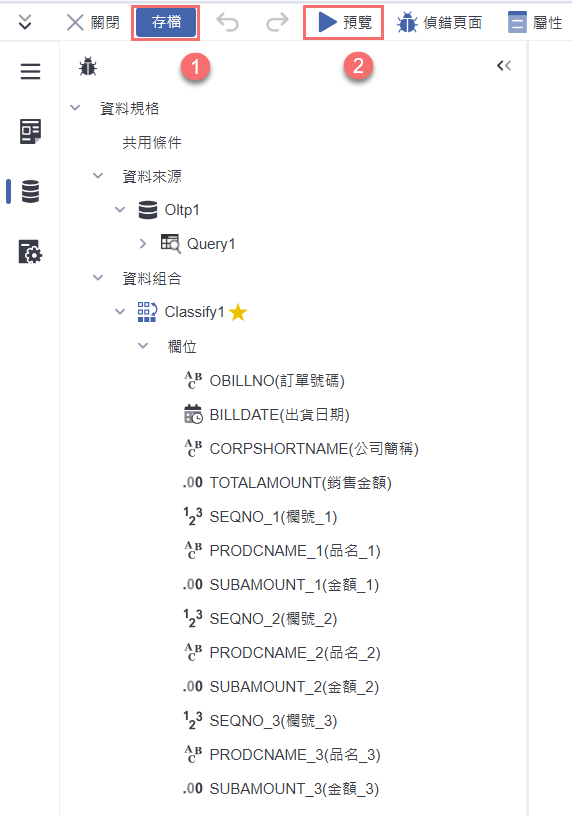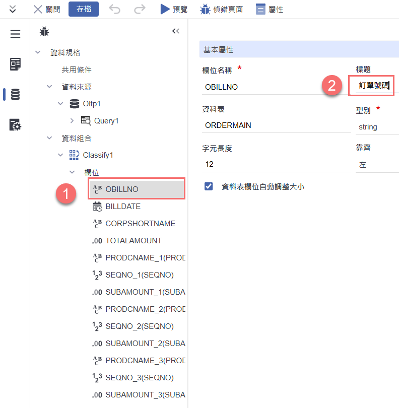 於分類統計資料組合(Classify1)下,點選欲修改的欄位(如:OBILLNO)後,在右側【基本屬性】區塊,調整該欄位的標題名稱(例如:訂單號碼),讓查詢呈現時的欄位名稱更易理解。完成後可依需要調整其他欄位標題。