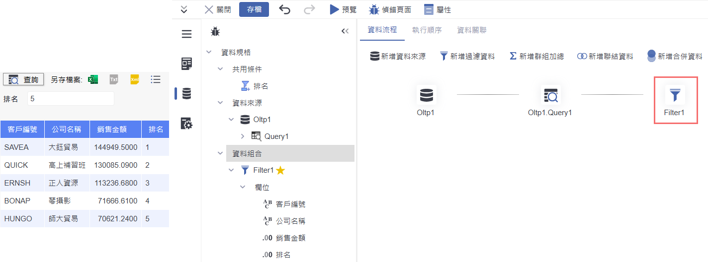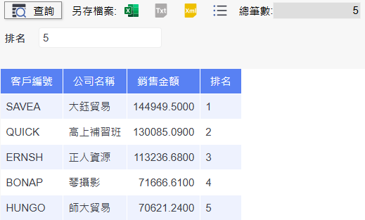 在預覽畫面中,輸入「排名」的條件值(例如:5),點選「查詢」後,即可顯示排名前五名的客戶資料,包含客戶編號、公司名稱、銷售金額與排名結果。這表示過濾資料功能已成功套用並正確呈現結果。