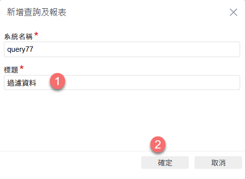 在「新增查詢及報表」視窗中,填寫【標題】(例如:過濾資料),設定完成後點選右下角的「確定」,進入查詢設計畫面。