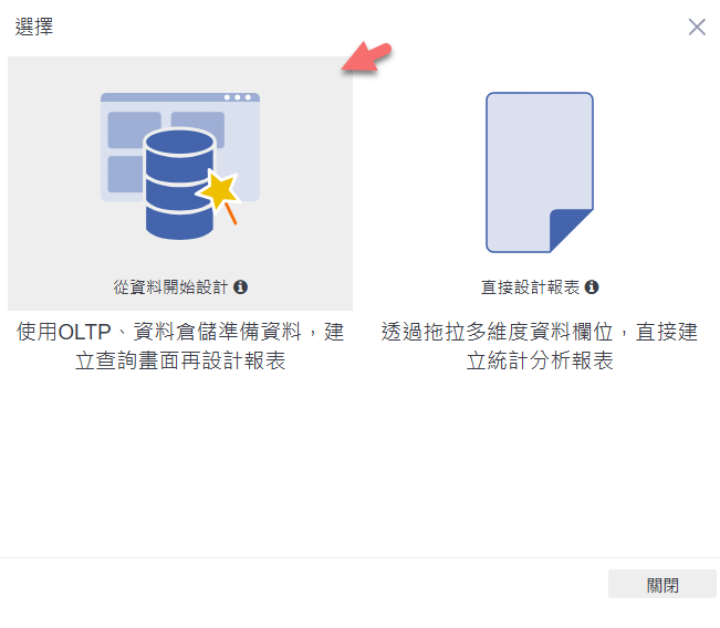 在出現的設計方式選擇畫面中,點選左側「從資料開始設計」,以資料表為基礎建立查詢畫面。