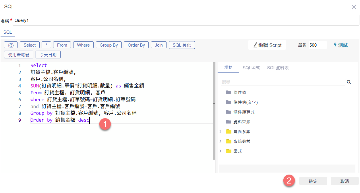 進入 SQL 編輯畫面後,輸入所需的查詢語法(如圖所示為銷售金額彙總查詢)。確認 SQL 無誤後,點選下方「確定」儲存查詢設定。