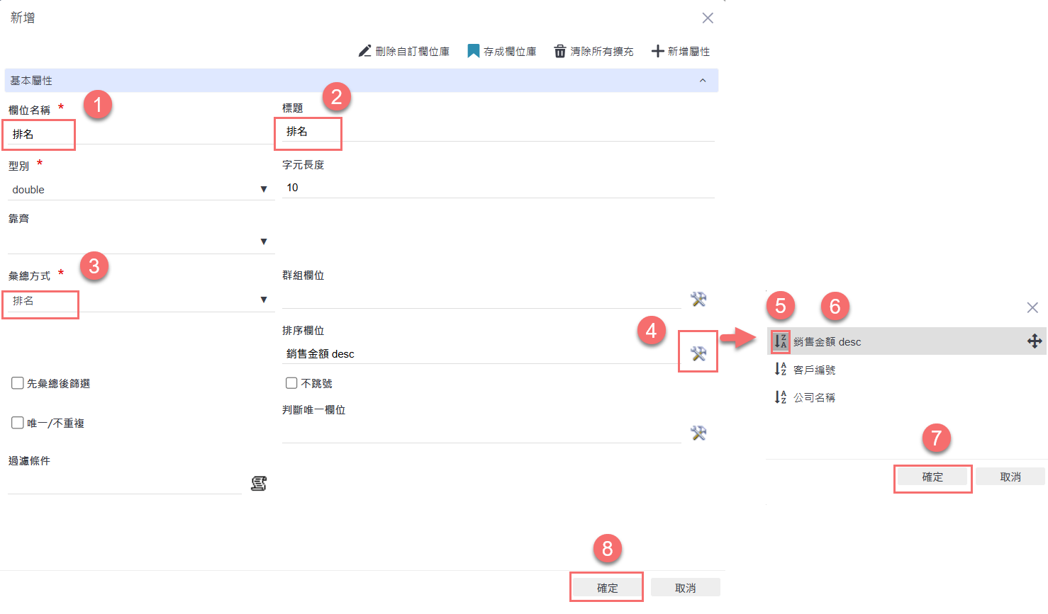 在新增彙總欄位畫面中,依序完成以下設定: