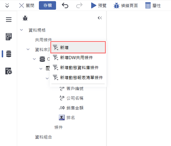展開資料來源中的查詢節點,點選「條件」區塊右鍵,選擇「新增」,以建立一組新的資料過濾條件,供使用者後續操作時進行查詢篩選。