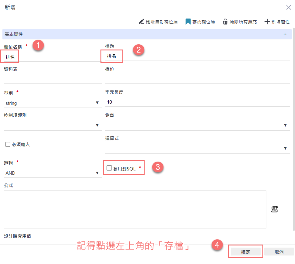 欄位名稱與標題輸入「排名」