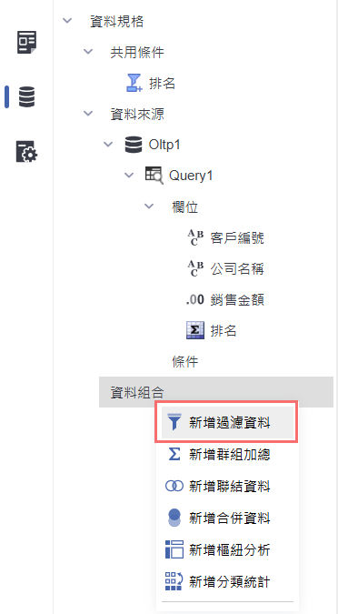 展開資料來源的查詢節點後,點選「資料組合」區塊右鍵,選擇「新增過濾資料」,建立一個新的資料組合,用來依照條件篩選資料內容,達到資料過濾的效果。