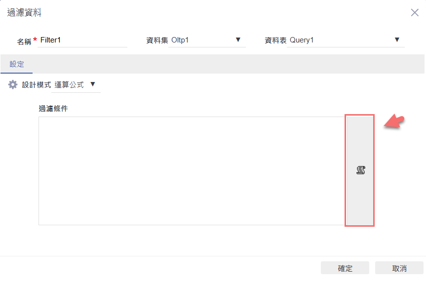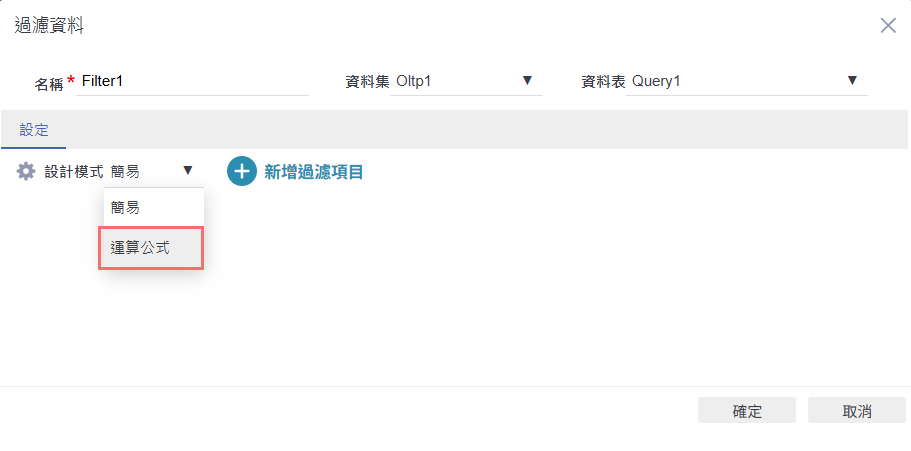 進入「過濾資料」設定畫面後,系統會自動套用查詢資料表(如:Query1)。於左上角選擇設計模式,從「簡易」切換為「運算公式」,以便自訂更進階的資料過濾條件邏輯。