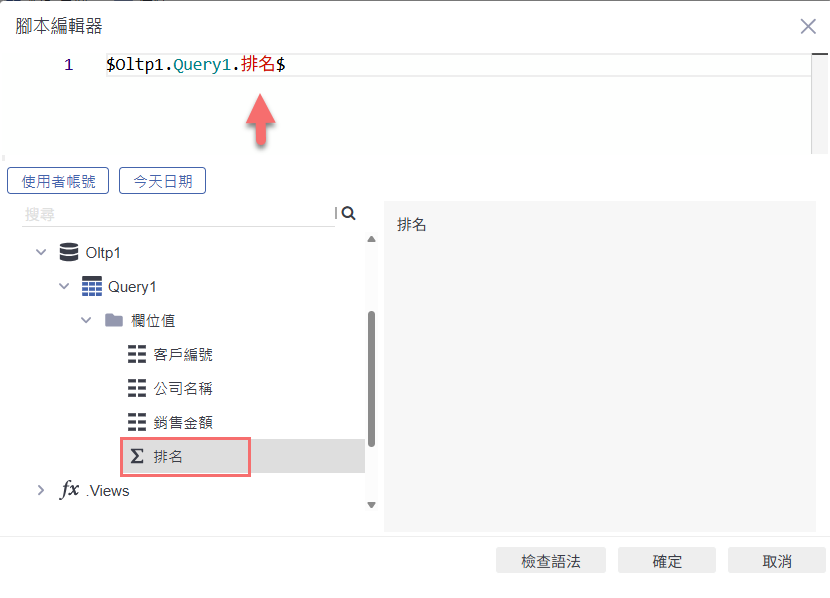 在設計模式選擇「運算公式」後,點選右側的「編輯器」按鈕,進入公式編輯區,手動輸入需要的過濾邏輯(例如:排名 <= 5),以篩選出符合條件的資料內容。