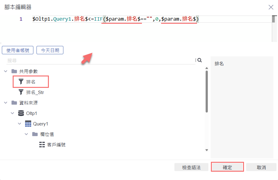 這段公式的邏輯是:當使用者未輸入「排名」值時,預設為 0,不顯示任何資料;若有輸入,則只顯示排名小於等於輸入值的資料。編輯完成後點選「確定」,儲存過濾條件設定。
