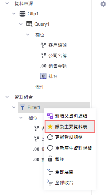 過濾資料組合建立完成後,於「Filter1」上點選右鍵,選擇「設為主要資料表」。此設定將指定過濾後的資料集作為後續報表設計的資料來源,確保畫面只顯示篩選後的內容。