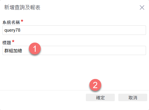 在「新增查詢及報表」視窗中,輸入標題(例如:群組加總),設定完成後點選「確定」,進入資料來源與欄位設計畫面。