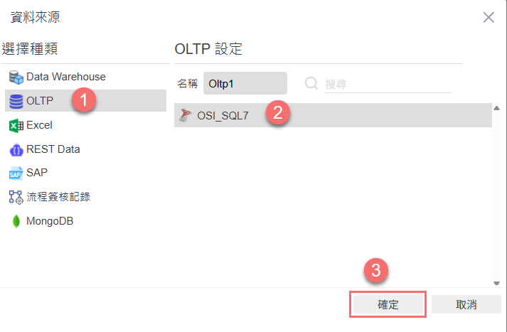 在「資料來源」設定畫面中,左側選擇來源類型為「OLTP」,右側點選欲使用的資料庫(例如:OSI_SQL7),確認後點選「確定」,完成資料來源的連結設定。